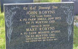 | 866 | Mary | Robyns | Tyn Llan Edern | Gweddw John Robyns | 21/06/1995 | 83 |